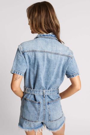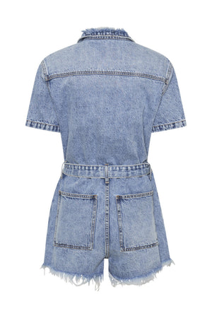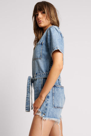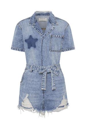 - The NIGHT MOVERS DENIM JUMPSUIT. An oversized denim playsuit with a waist tie to cinch everything in. Features heavy distressing on front legs, a relaxed fit, roomy side pockets and back pockets and one chest pocket.