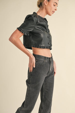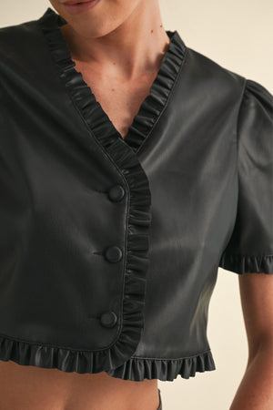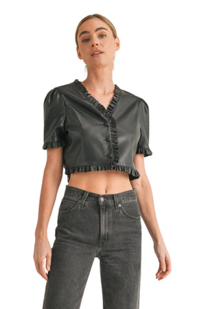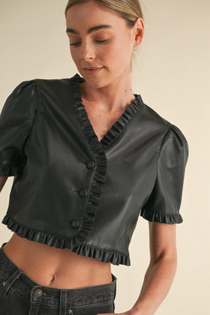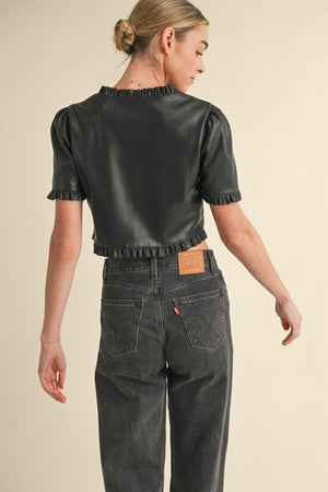 LEATHER SHORT SLEEVE BUTTON DOWN RUFFLED TOP