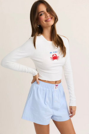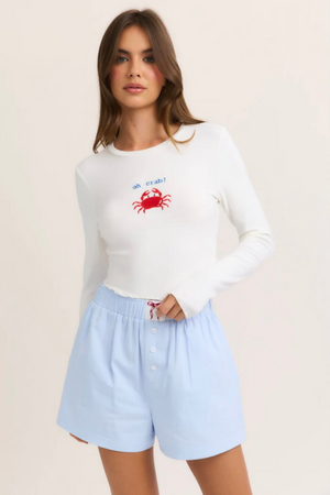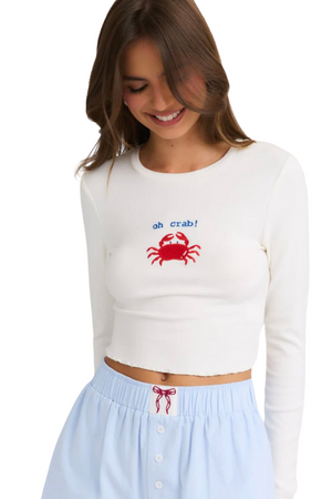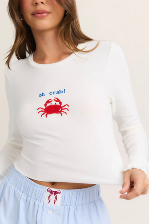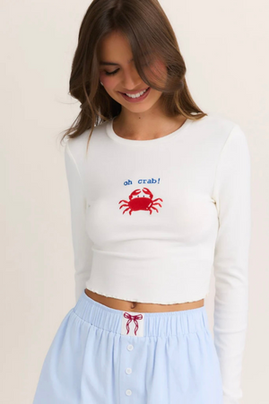 ROUND NECK LONG SLEEVE CRAB EMBROIDERED FITTED KNIT TOP