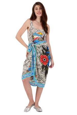 • Front of the suit is a gray snakeskin print with a colorful floral graphic.