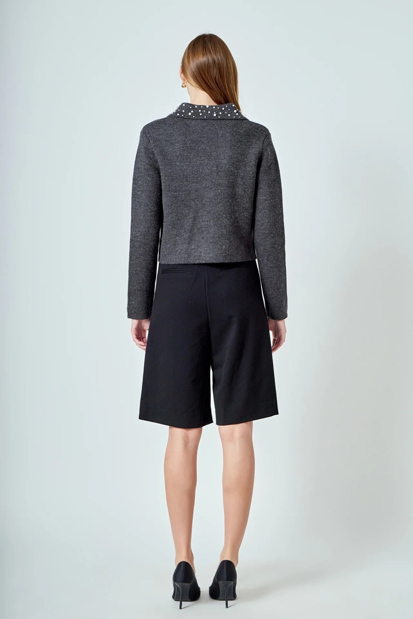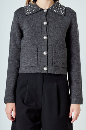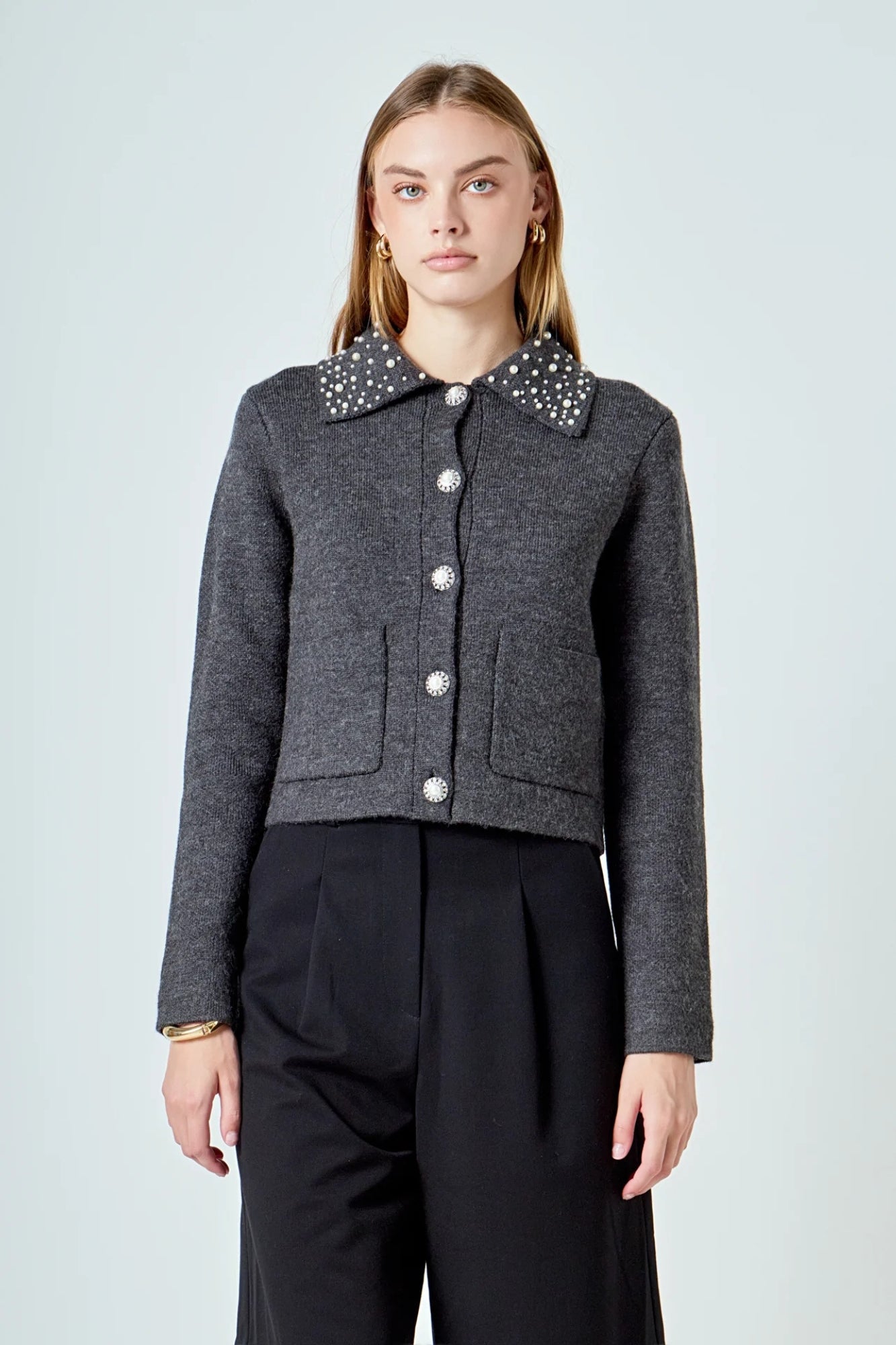 PEARL EMBELLISHED COLLAR GREY CARDIGAN