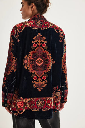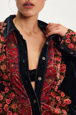 - Features: Soft velvet fabrication, contrast floral print, dropped shoulders, cuffed long-sleeves, collared-neckline, shirttail hem, button closures.