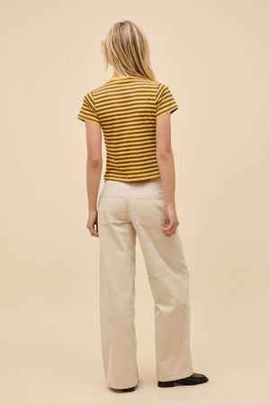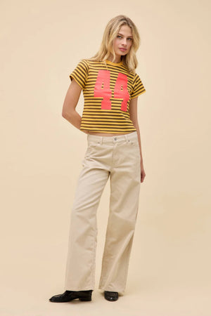 • A striped shrunken tee with oversized numbers reminiscent of a thrift store find makes for a major league look