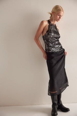 - Dazzle and dance the evening away in this sequin-covered cami from Intimately, featuring a high neckline, eyelash lace trim, and a detailed, delicate lace racerback for a head-turning, all-over-gorgeous style.