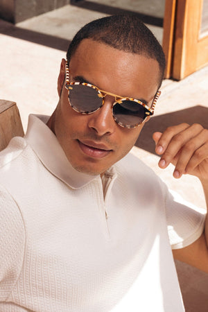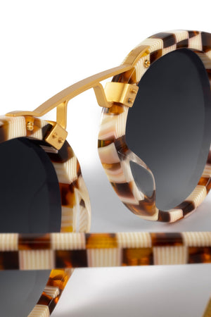 • This handcrafted frame is a combination of glossy acetate and glossy 24K gold-plated stainless steel hardware