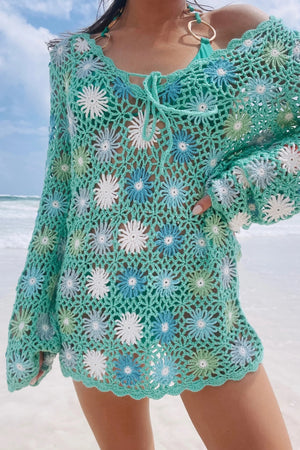 - Beach bound with drink in hand in this blue floral crochet coverup with long sleeves and a sweet tie front