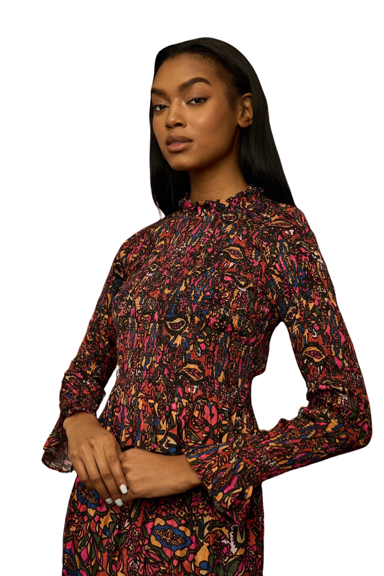 - This adaptable garment with a smocked bodice is given a romantic touch by the voluminous sleeves and ruffled collar.
