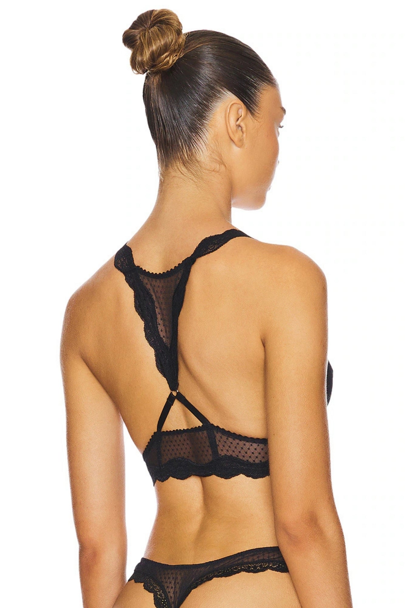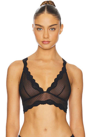 Features: Sheer mesh fabrication with dotted detail, lace trim, low-cut neckline, darting at bust, unlined cups, racerback detail